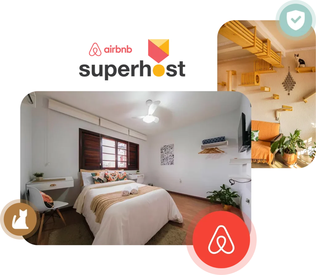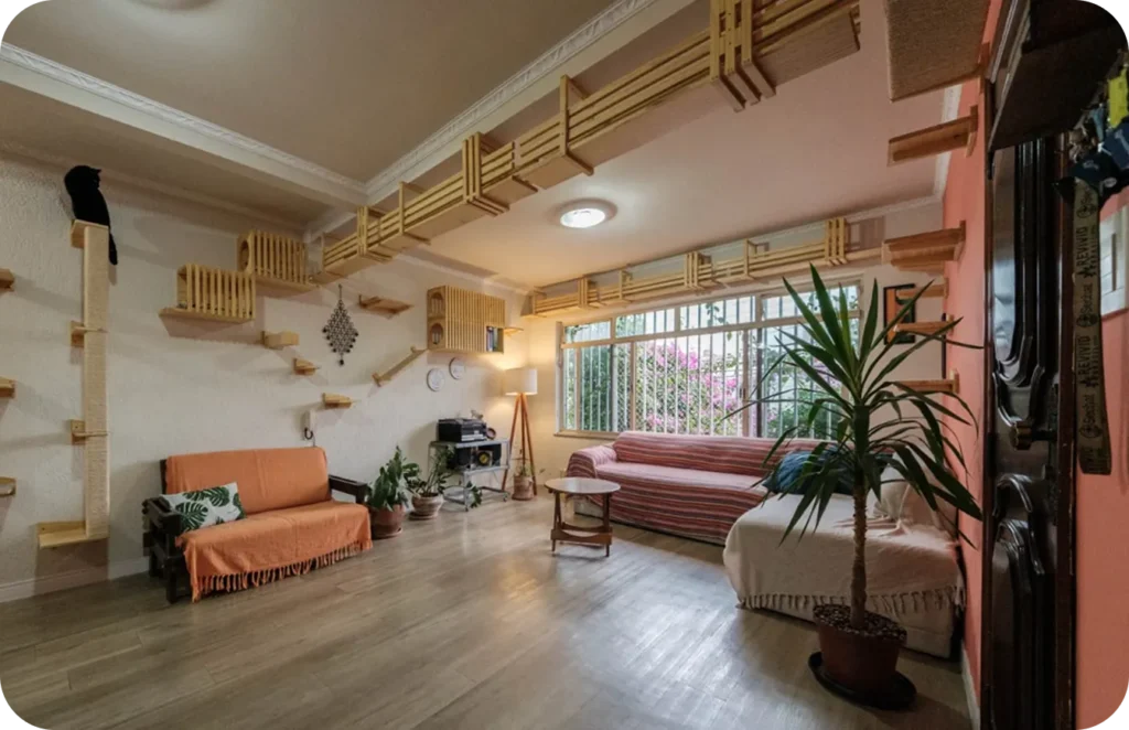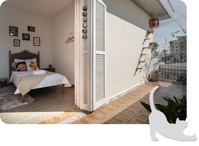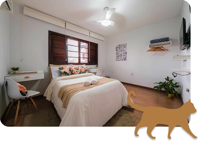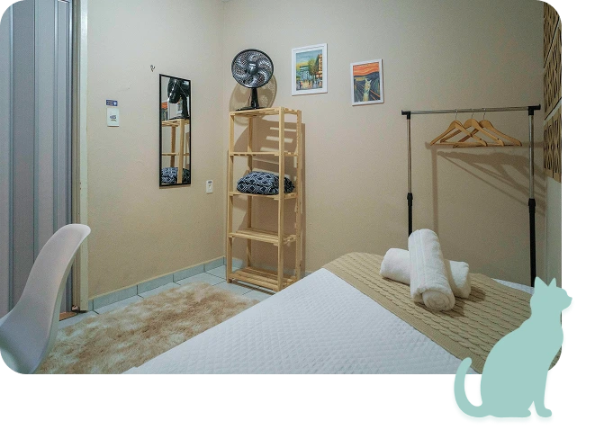 Aqui, o ambiente é leve, organizado e acolhedor, com espaços limpos, energia tranquila e convivência harmoniosa com os co-anfitriões “miau”.